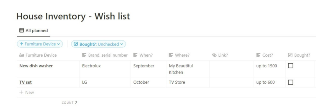 The third part is a wish list with things you want/need to buy. This is a linked database. When you buy something and check “Bought?” checkbox - this item will automatically show up in House Inventory Table.