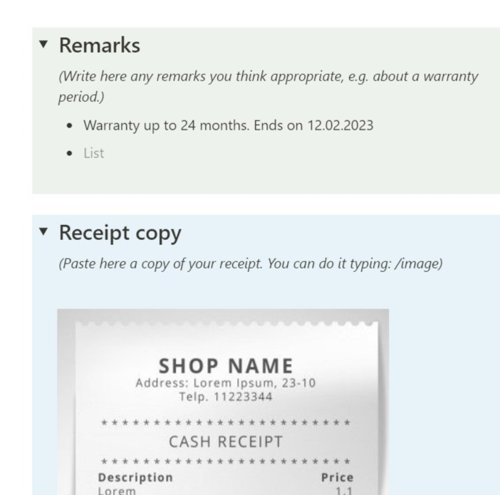 - Remarks - where you can add any other relevant information, e.g. about a warranty period or installments to be paid.
