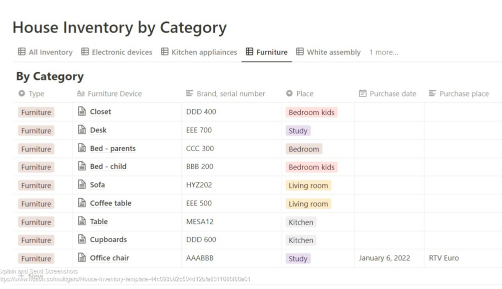 The first part is a database with the most important information: item, brand, serial number, purchase date, purchase date, place in your house. There are several preset views: