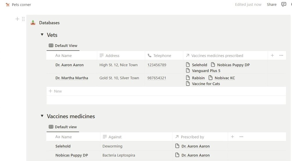 • Vaccines Medicines database - where you store info on the vaccines and medicines with their descriptions and vets who prescribed them.