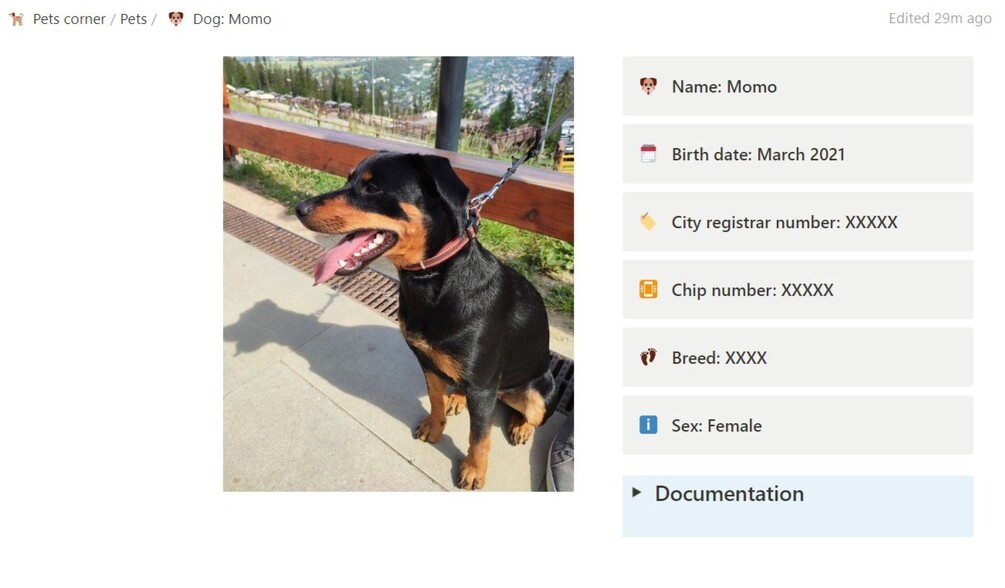 • Documentation - here you write or/and upload all important documentation, e.g. registration number, chip tag photo etc.